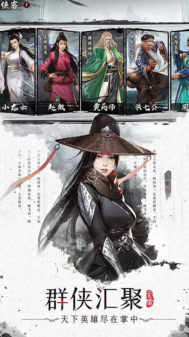射雕三部曲中百位传奇大侠齐聚,收集侠客研习武功养成天下第一人!